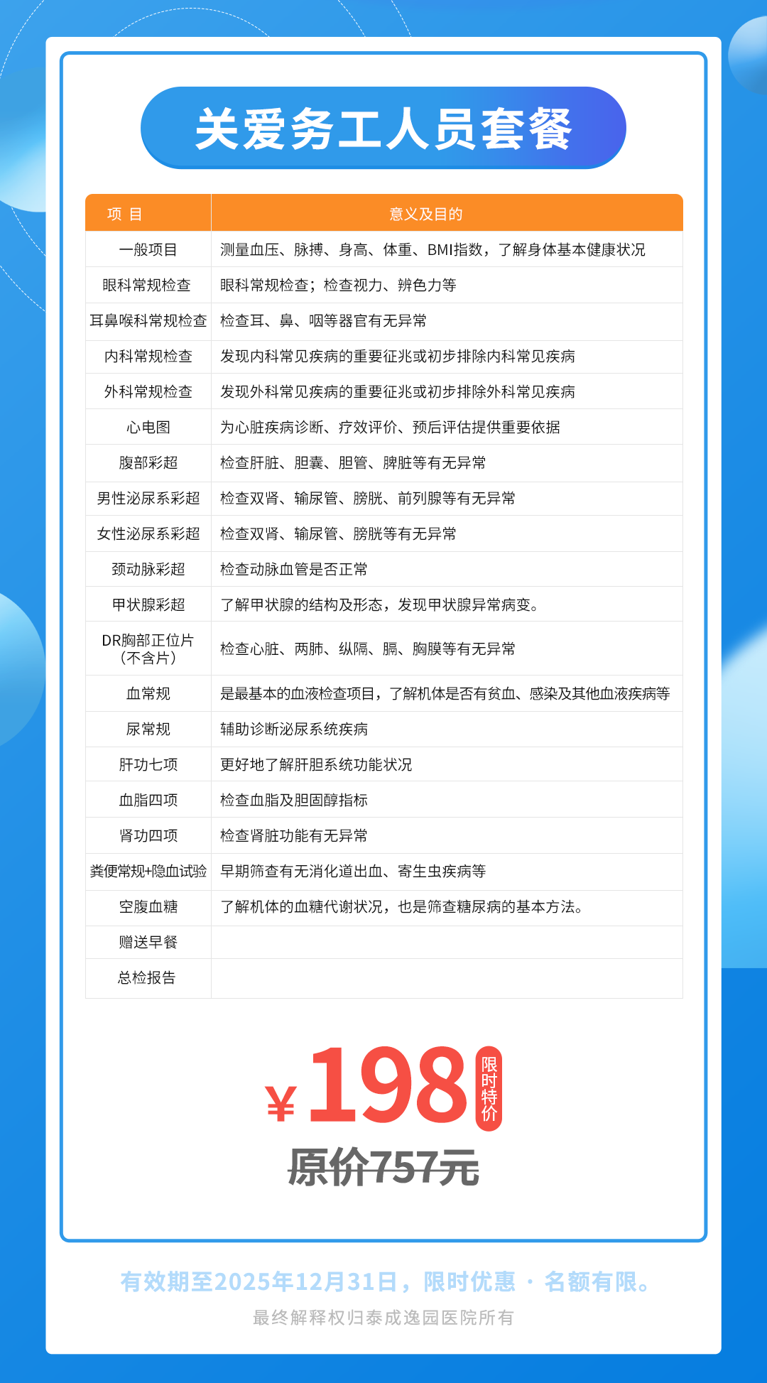 打工人熬夜加班,身体亮红灯却没时间检查?父母年纪渐长,心脑血管、老年易发疾病让人牵挂?忙碌的生活里,健康永远是最珍贵的底气!泰成逸园医院「健康体检优惠月」重磅上线,三大精选套餐,从务工人群到中老年父母,覆盖全家健康需求,限时优惠 + 名额有限,赶紧为自己和家人安排上~